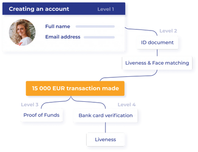 You create and control multiple, parallel verification journeys in a few clicks, right from the dashboard. Choose a user group or a trigger, combine types of checks needed, define decision rules and customize the look of the flow.